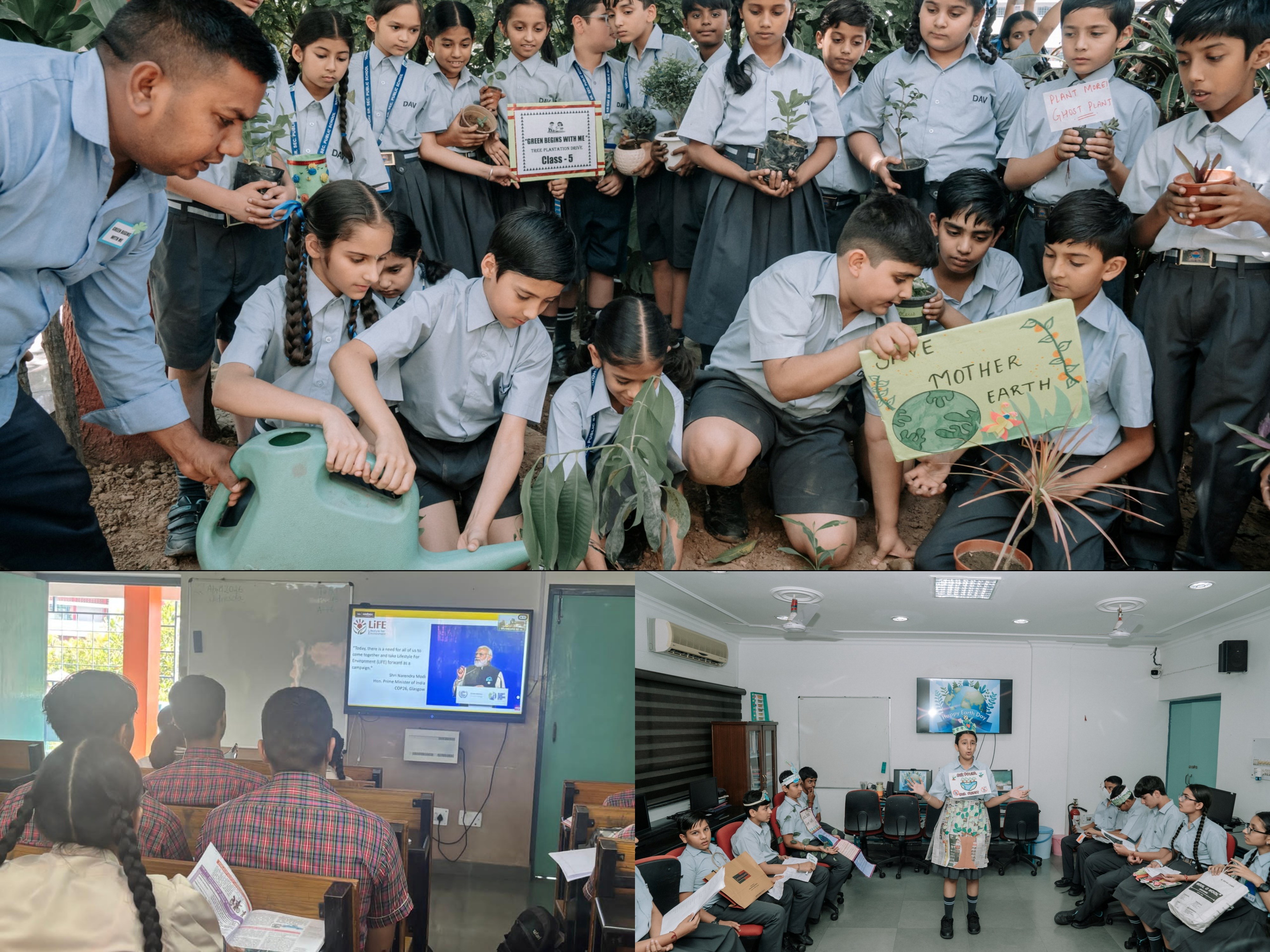Under the aegis of the Partnership Programme, twenty-three students from the Government School, Sector 8, converged with KB DAV learners of Class IX to partake in a stimulating poster-making competition, fostering inter-institutional camaraderie and a shared environmental consciousness. Concurrently, an Elocution Competition for Class VIII bore witness to the spirited participation of 31 students, who delivered eloquent, thought-provoking renditions of poems centered on the Earth Day theme, demonstrating remarkable oratorical prowess. A plantation drive centered around the theme—"Green Begins with me" was further conducted for the students of Classes III to VII, instilling within them a tangible and enduring sense of environmental responsibility.